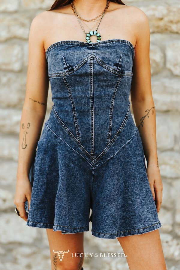 Dark Wash Fluttered Ruffle Strapless Romper - L&B